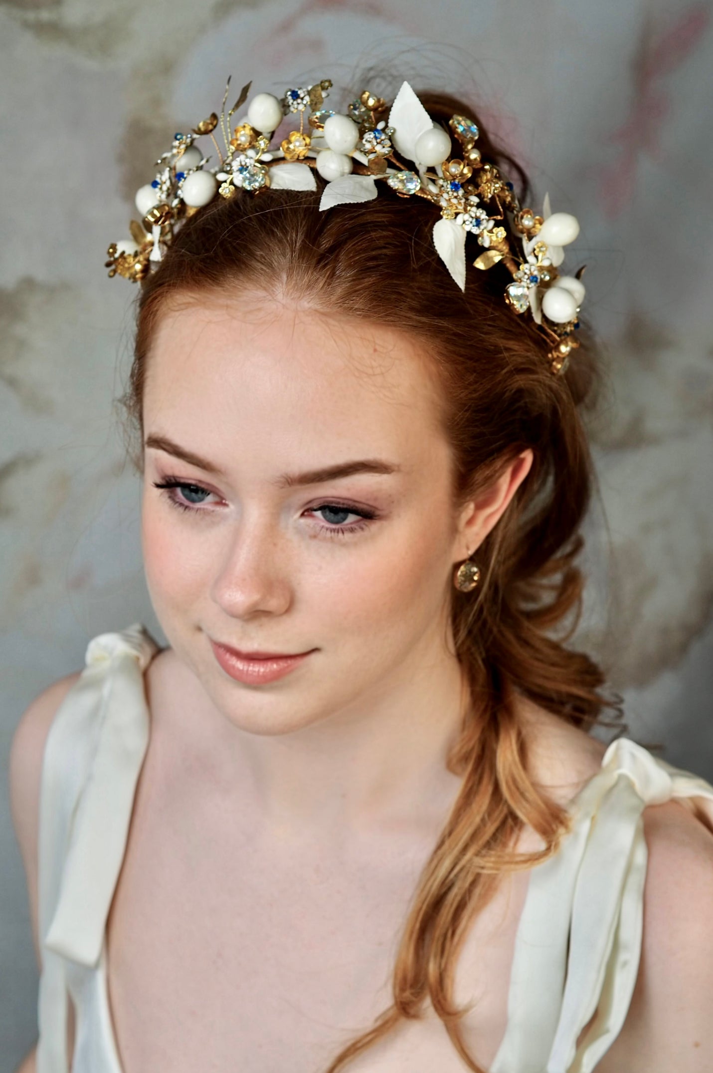 Evoking the grandeur of la Belle Époque, the Howard Tiara blooms with hand-painted florals and antique gold accents. A piece of quiet opulence, it carries the romance of a bygone age into the modern bride’s story — an heirloom of artistry, beauty, and grace.
