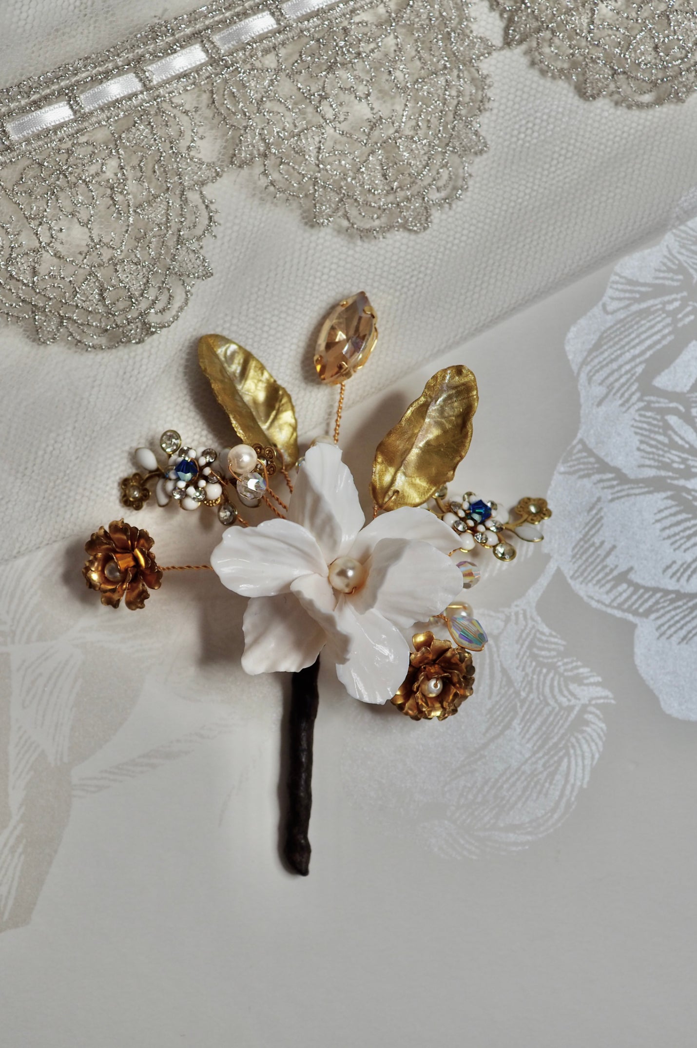 Our Groom’s Boutonnière features a hand-sculpted ivory clay flower, framed by gilded golden leaves and accented with delicate apricot-toned crystals and pearl-centred golden blossoms. A subtle ‘something blue’ is nestled within the design for a meaningful bridal tradition. Boutonnières can be colour-matched to your wedding palette — please enquire to customise.