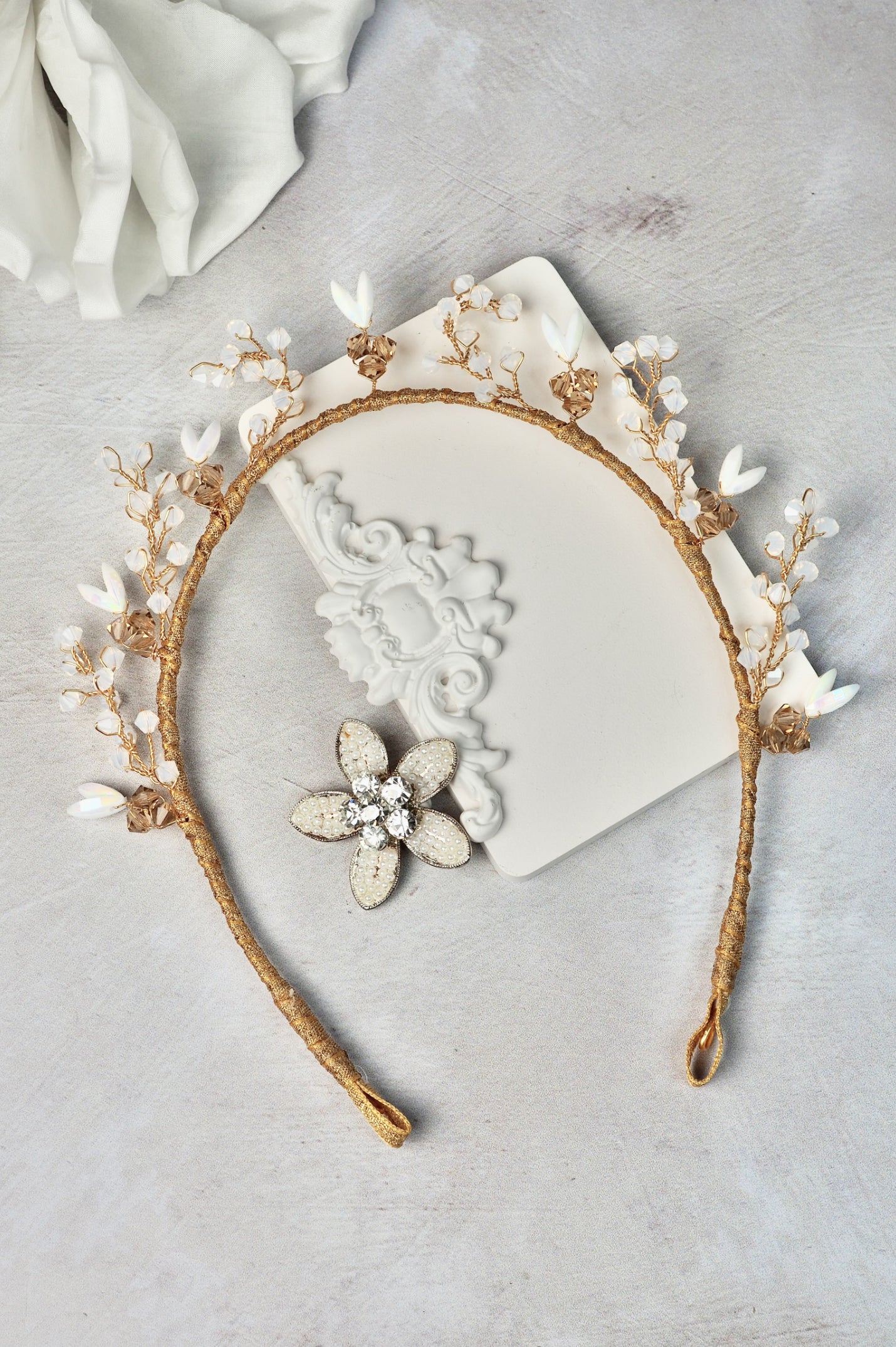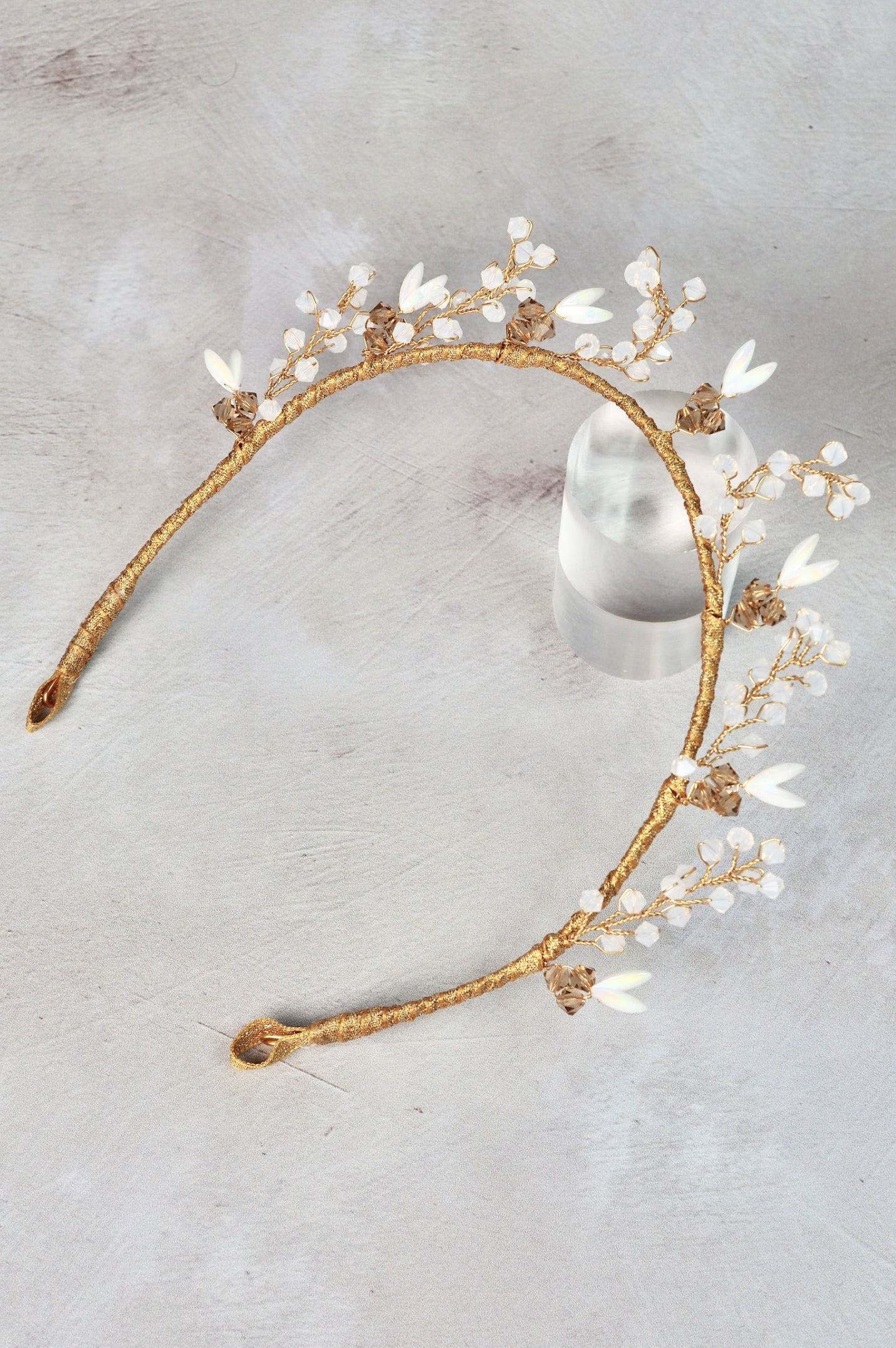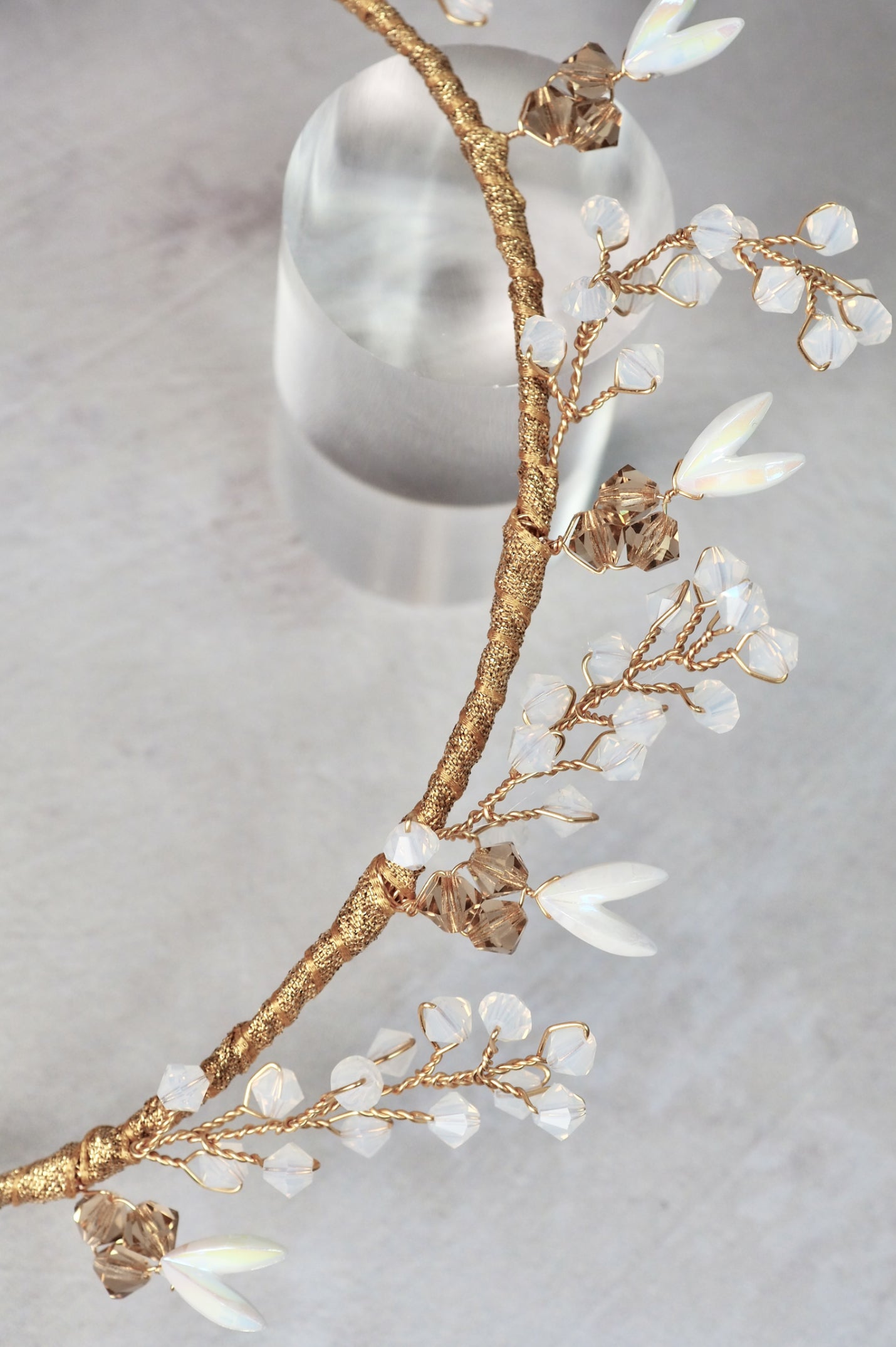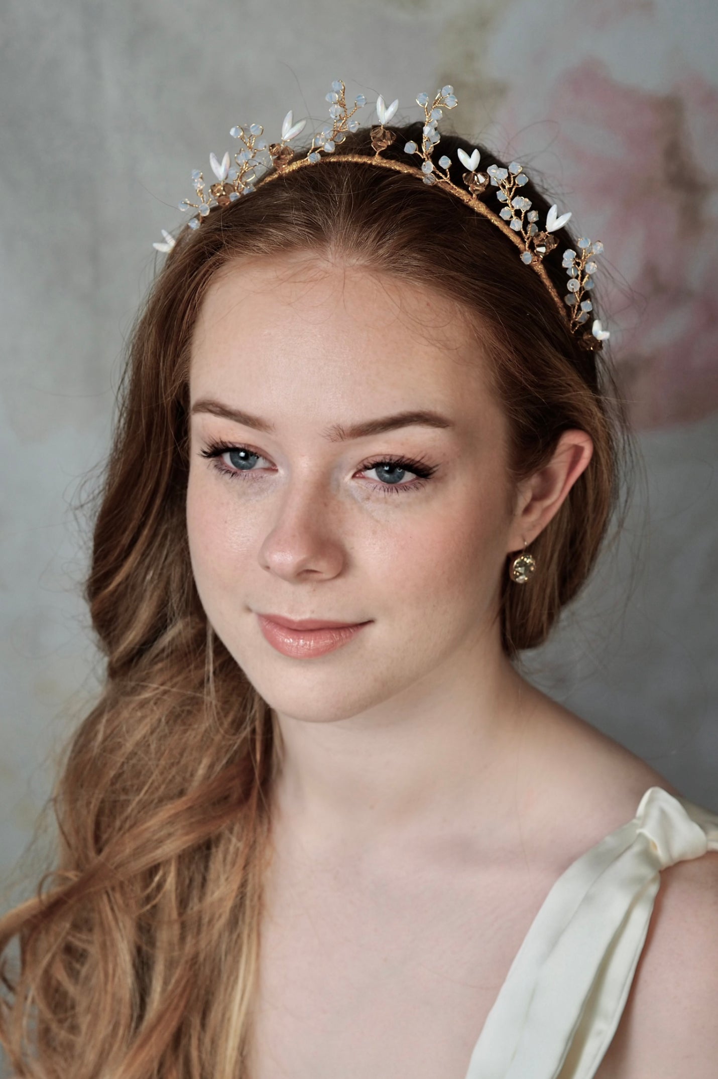 The Lucienne Tiara is a vine-inspired beauty, delicately sculpted along a warm gold base that glows against the hair. Honey-toned crystals are nestled amongst soft white opal elements, creating a harmonious blend of warmth and luminosity. Each branch-like detail feels organic and effortless.