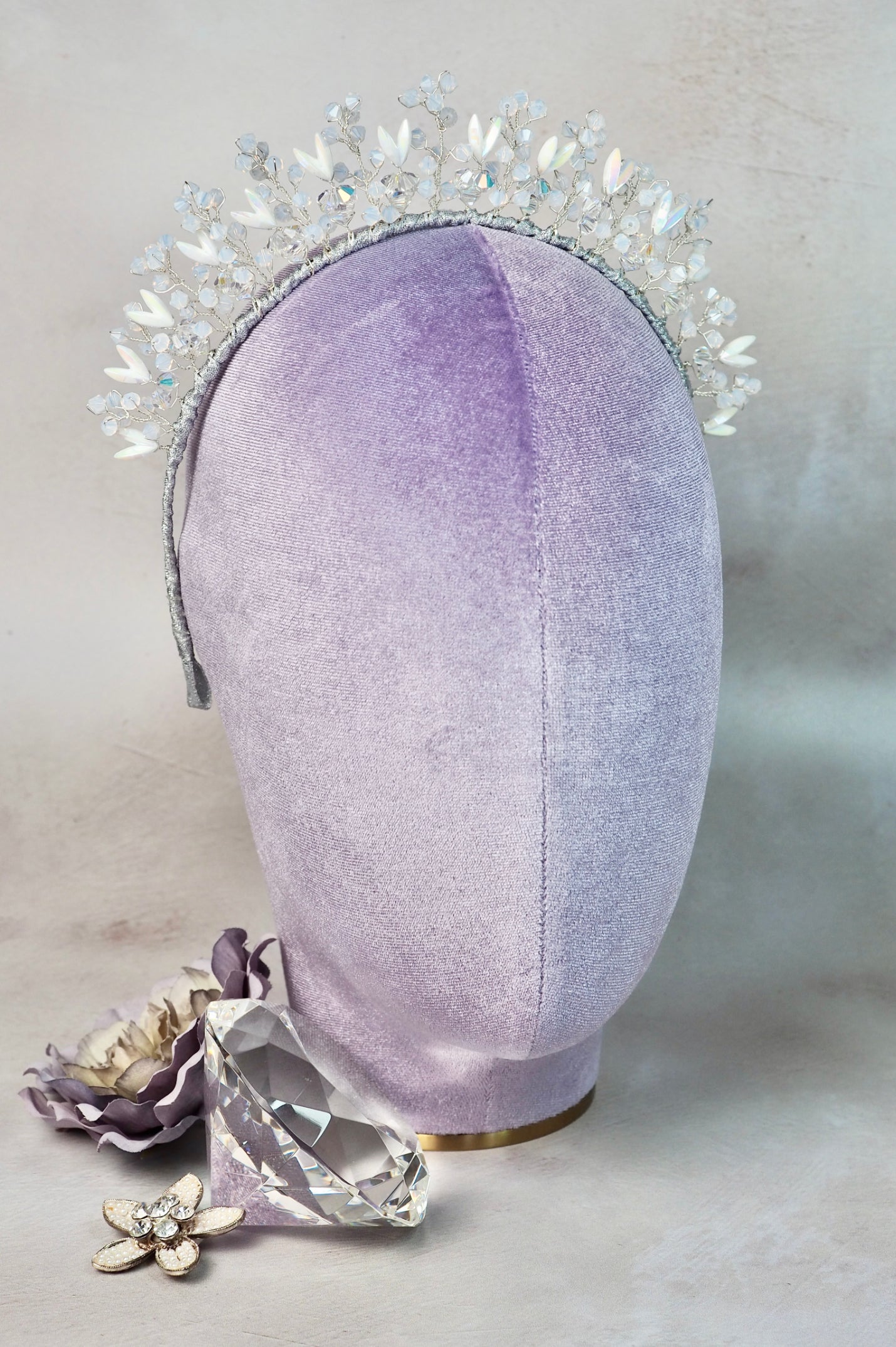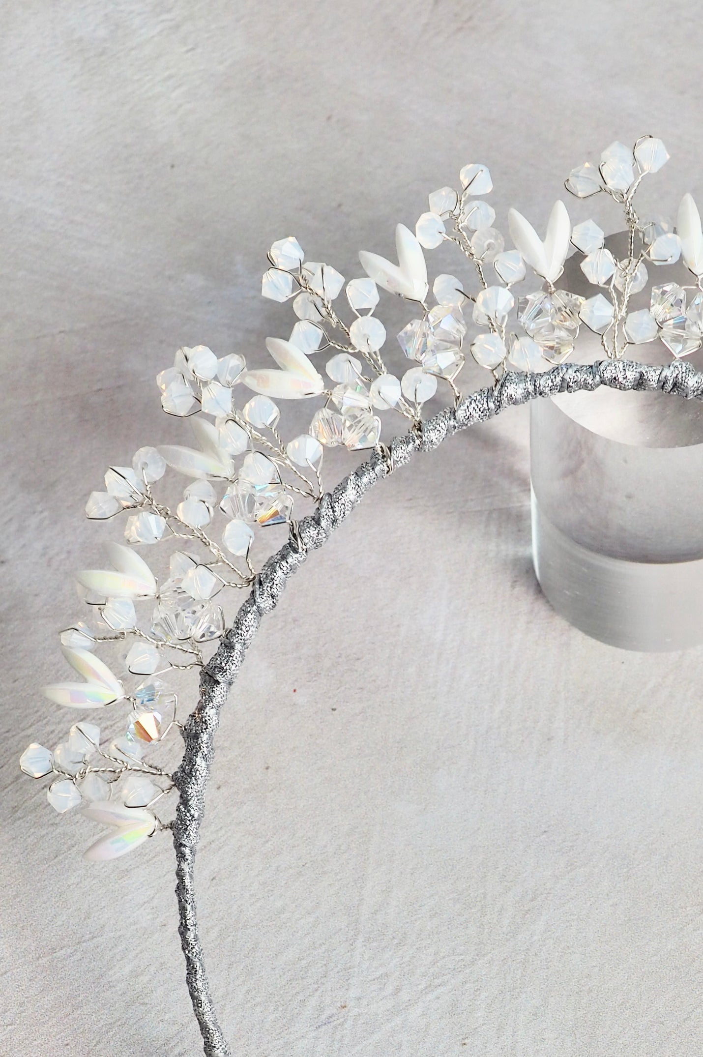The Marcelline Tiara sits upon a refined silver base, where delicate branches rise in a constellation of white fan-shaped beads and luminous opal crystals. The silhouette feels airy and light, almost like frost-tipped leaves catching early morning light.